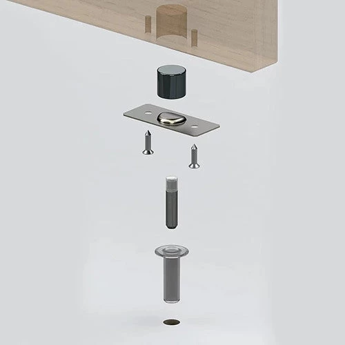 - In-floor pin activated by rare-earth magnet concealed within the door