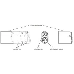 A special extended base cylinder is required as it has two tapped holes in the back of the cylinder to accept the assembly screws to retain the extension kits. These cylinders use the standard 570 type barrel.