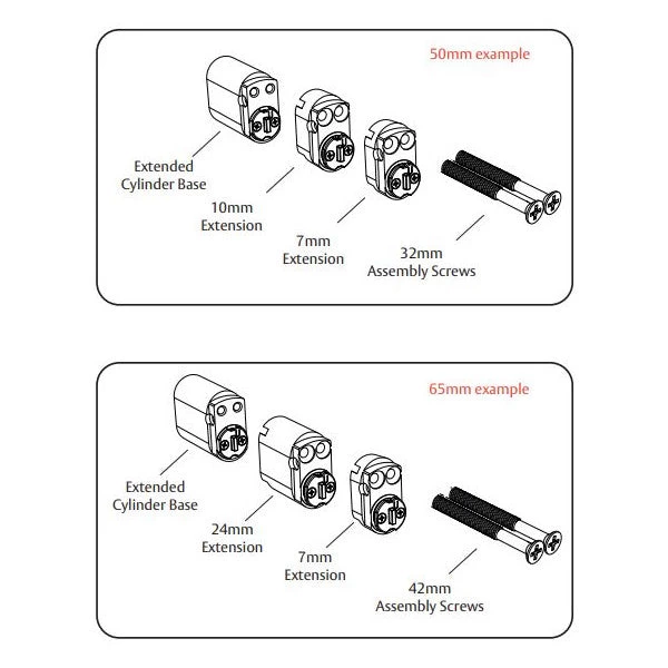 There are three different size extension kits that can be mixed and matched with the extended cylinder base to make up the desired length cylinder. They come in 7mm, 10mm and 24mm sizes. Each kit comes complete with the cylinder extension, barrel extension and universal barrel adaptor screwed to the barrel extension. Once the cylinder is assembled the rear barrel adaptor is removed and the standard locking cam (X, Z, Y, etc.) is fitted to operate the mortice lock.
