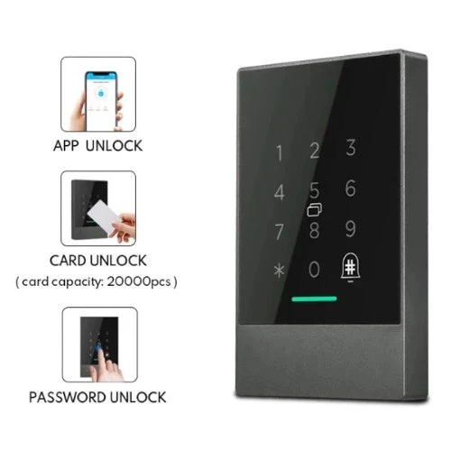 Description Access Control MLA02 with TT Lock app, pin number and RFID fobs for electric strike plates, magnet latches, auto door openers, garage doors, sliding gates. Waterproof rate is IP66. Works on 12V DC only.