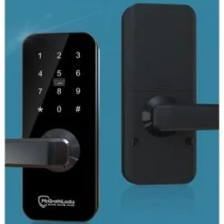 A sleek door lock with Bluetooth app, pin code, RFID card and manual key to provide quick and convenient access.